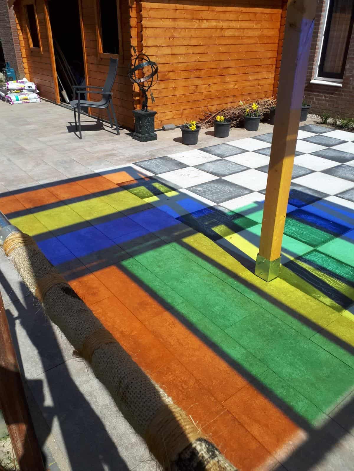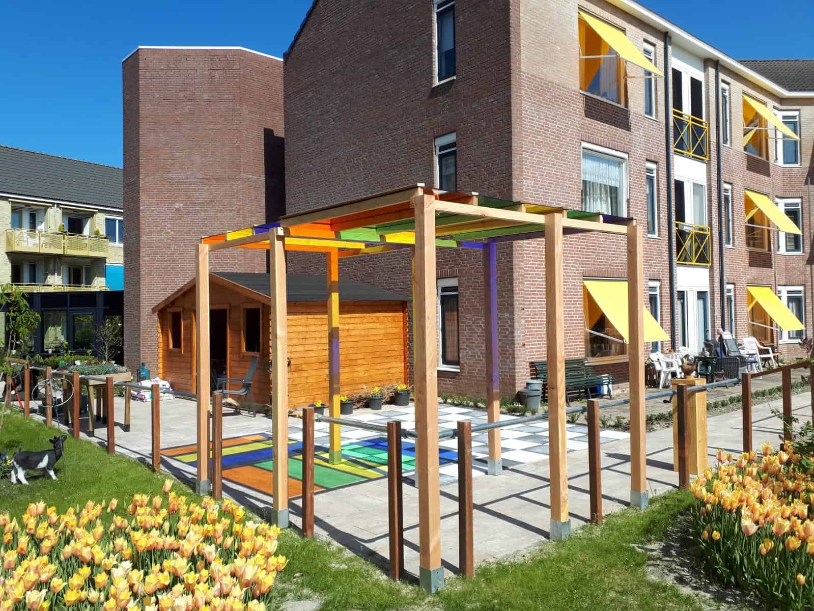 De trap in de tuin is speciaal gemaakt voor therapeutische oefeningen. Hieraan zijn verschillende materialen bevestigd, die weer bijdragen aan het element ‘voelen’. Bewegen en voelen komen zo mooi samen. De trap wordt goed gebruikt in de fysiotherapeutische behandelingen van de cliënten. De glimlach van de bewoonster neemt niemand meer af!